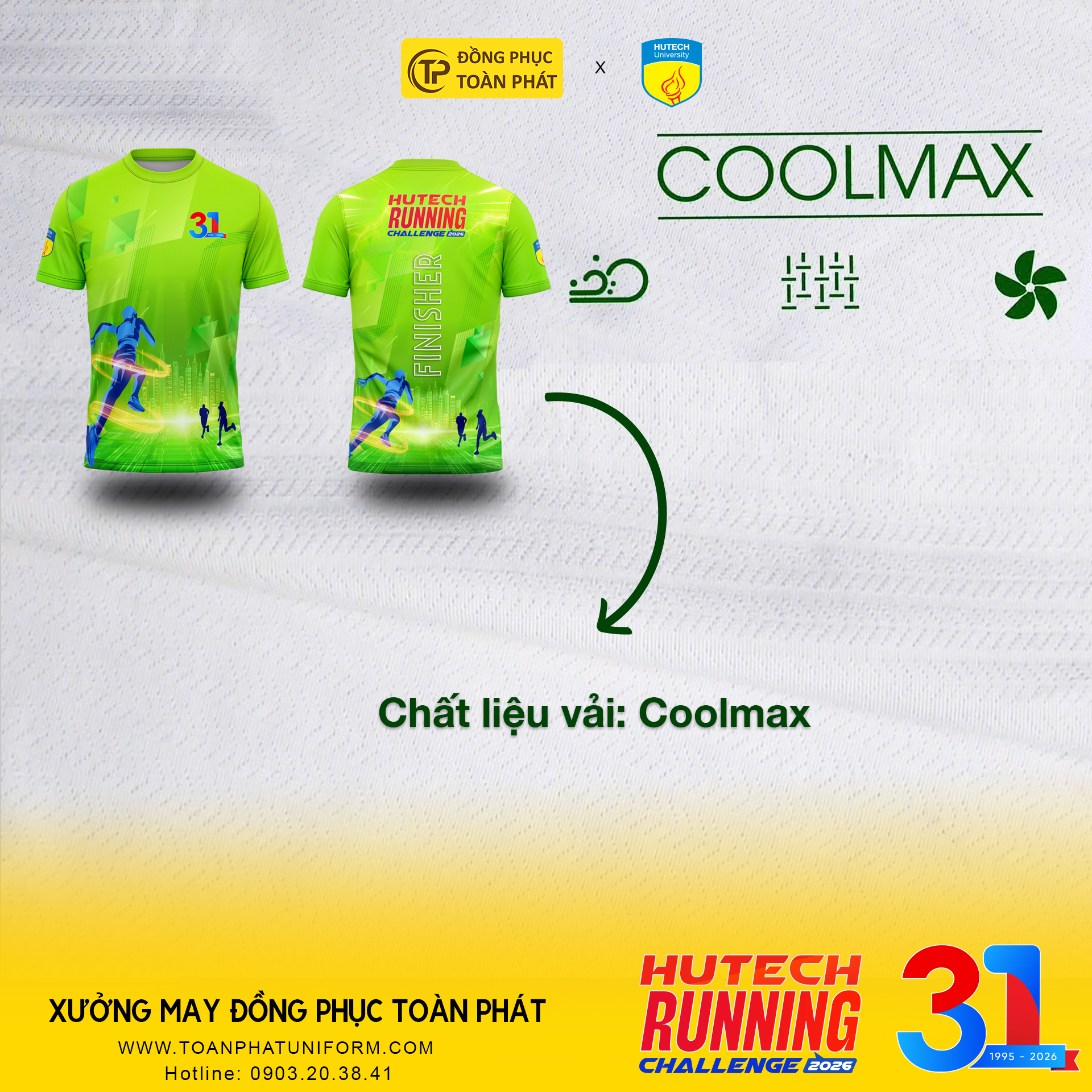 Nhân dịp kỷ niệm 31 năm thành lập Trường Đại học Công nghệ TP.HCM (HUTECH), mẫu áo chạy bộ HUTECH Running Challenge 2026 được thiết kế nổi bật, hiện đại, mang đậm tinh thần năng động và khát khao chinh phục.