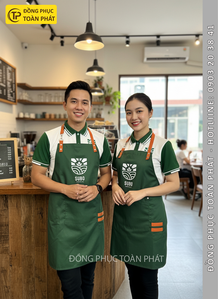 Logo SUBO được in sắc nét trên áo và tạp dề, giúp khách hàng dễ dàng ghi nhớ thương hiệu.