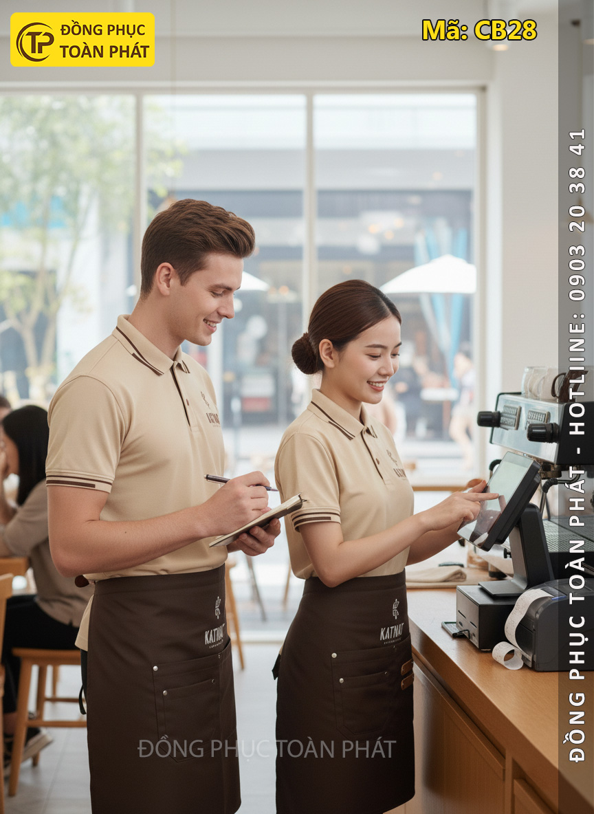 Mẫu đồng phục CB28 được Toàn Phát thiết kế riêng cho hệ thống Katinat Saigon Kafé, mang phong cách sang trọng và đậm chất cà phê Sài Gòn hiện đại.