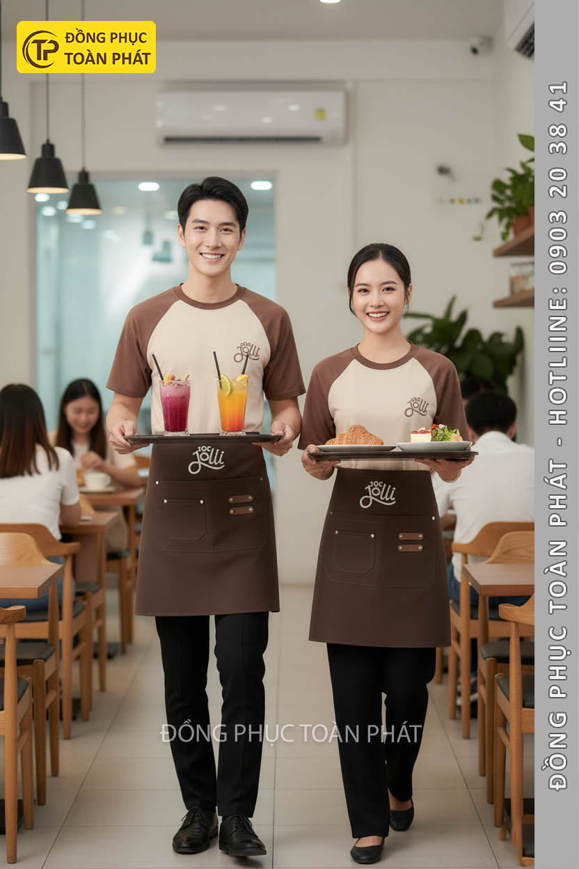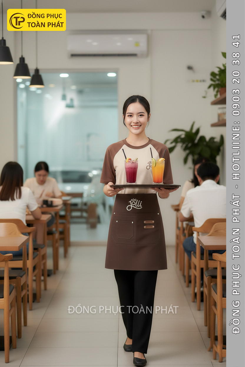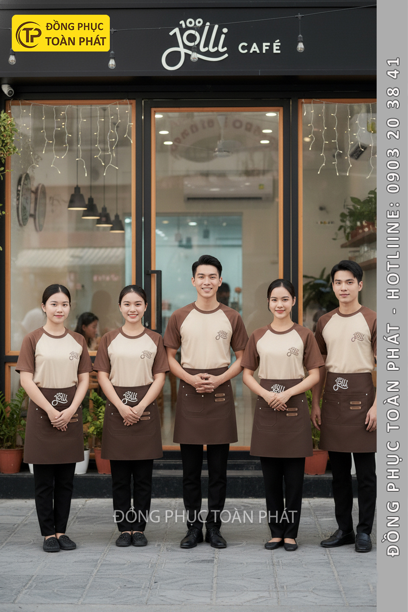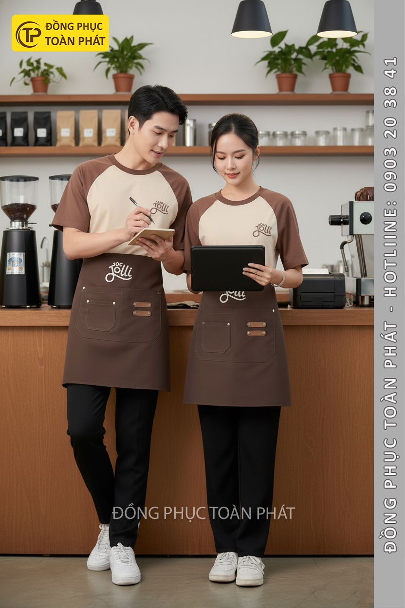 Áo phối 2 tông màu nâu – kem nhẹ nhàng, tạo cảm giác ấm áp, gần gũi đúng tinh thần của một thương hiệu cà phê hiện đại. Logo “Jolli” được in nổi bật ở ngực áo và tạp dề, giúp nhận diện thương hiệu rõ ràng và tinh tế.